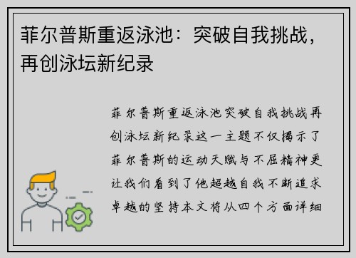 菲尔普斯重返泳池,突破自我挑战,再创泳坛新纪录,这一主题不仅揭示了菲尔普斯的运动天赋与不屈精神,更让我们看到了他超越自我、不断追求卓越的坚持。本文将从四个方面详细探讨这一过程:首先,菲尔普斯如何在退役后重返泳池并重新定义自己的极限;其次,他如何通过科学训练与合理规划恢复巅峰状态;第三,菲尔普斯的复出赛场成绩,如何在赛事中刷新自己与世界纪录;最后,菲尔普斯的精神力与运动员心态如何支持他战胜困难、打破极限。通过这些方面的阐述,本文将深入分析菲尔普斯如何凭借毅力、科学训练和心理素质,实现了游泳运动中的再次飞跃。