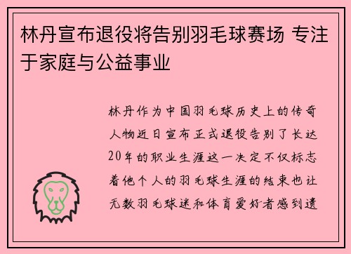 林丹,作为中国羽毛球历史上的传奇人物,近日宣布正式退役,告别了长达20年的职业生涯。这一决定不仅标志着他个人的羽毛球生涯的结束,也让无数羽毛球迷和体育爱好者感到遗憾和不舍。林丹的退役不仅仅是体育界的一个新闻事件,它更是一次标志性的转变,表明他将把更多的精力投入到家庭生活和公益事业中。从林丹的职业生涯到他的退役原因,再到未来的发展方向,我们可以看到他不仅是一个伟大的运动员,更是一个具有深厚社会责任感的公众人物。本文将从四个方面详细阐述林丹宣布退役的背景及其未来规划,分别从他的羽毛球成就、退役的原因、退役后的家庭生活及其公益事业的计划等方面进行分析。